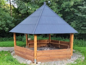 Nyd naturen og bålet i skøn bålhytte med plads til alle, hvor snobrød og andet kan laves over bålet, mens andre kan sidde på den omkransende bænk.
